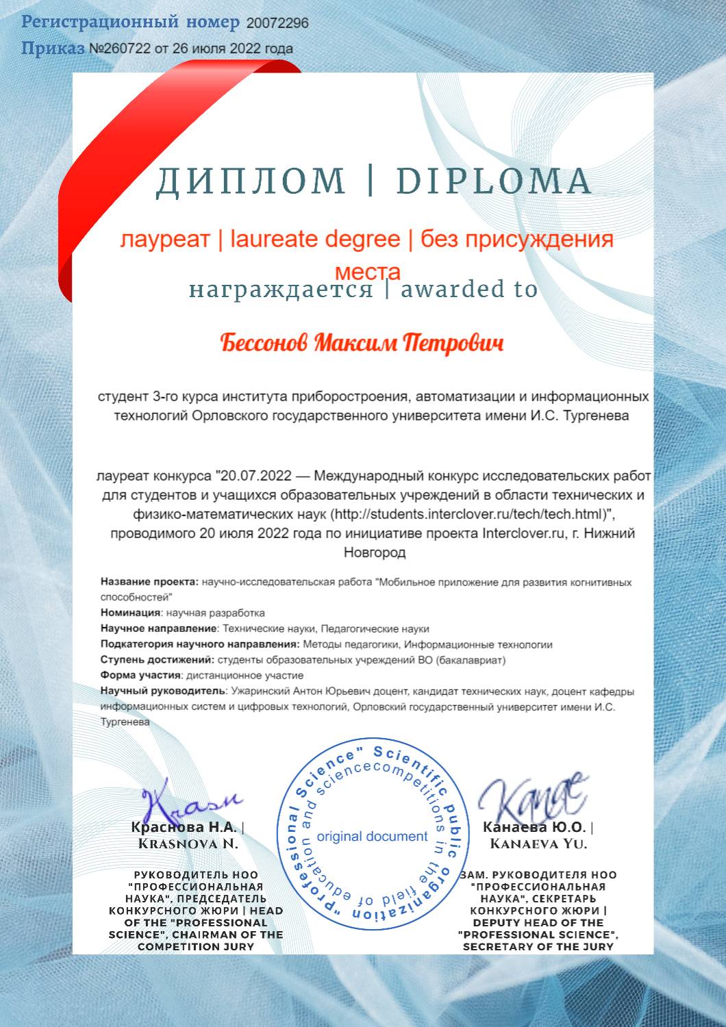 | 3) Международный конкурс исследовательских работ для студентов и учащихся образовательных учреждений в области технических и физико–математических наук. Номинация: образовательный проект. Учредитель: НОО «Профессиональная наука». Приказ: №260722 от 26 июля 2022 года. Город: Нижний Новгород |