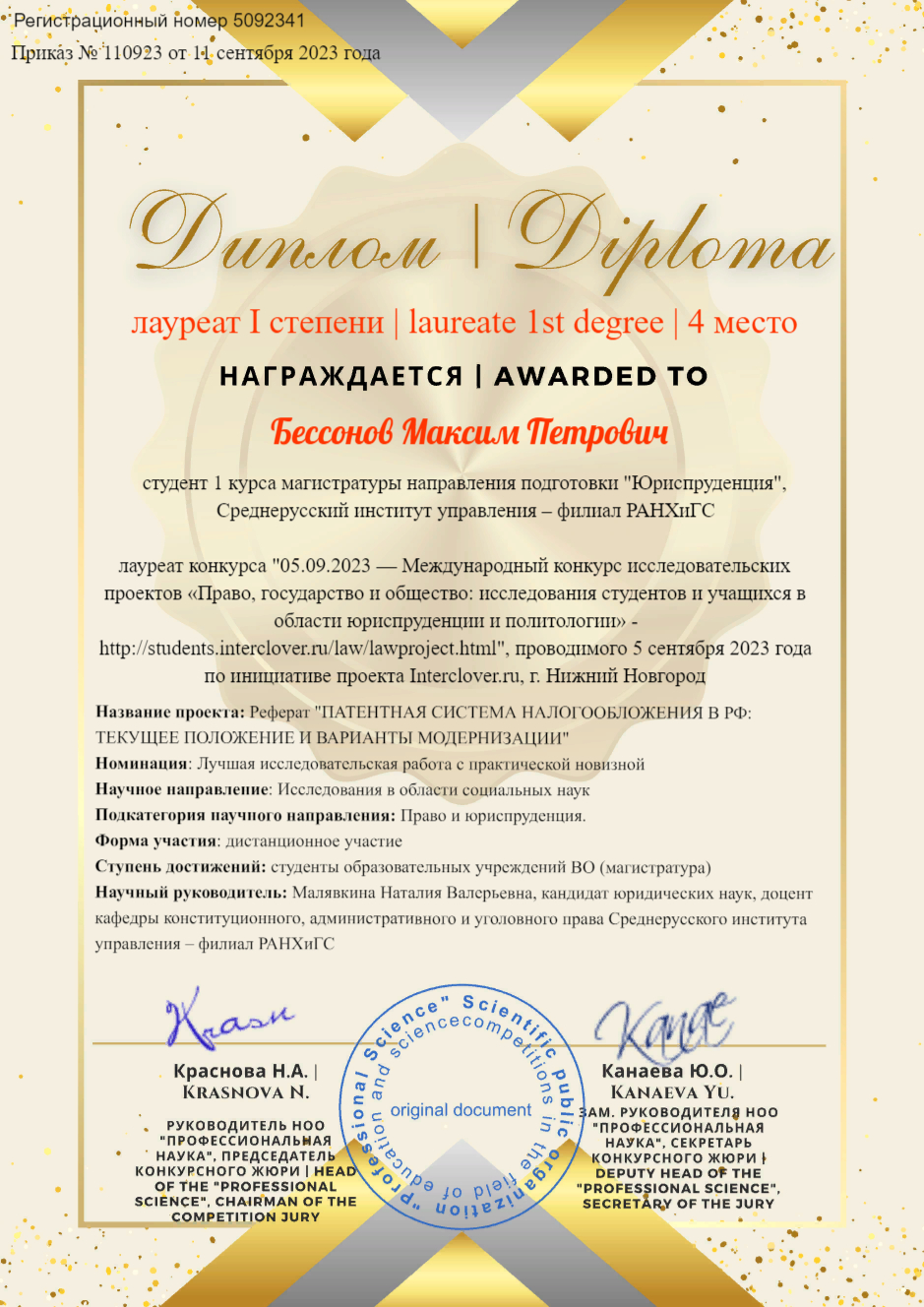 | 6) Международный конкурс исследовательских проектов «Право, государство и общество: исследования студентов и учащихся в области юриспруденции и политологии. Номинация: научно-исследовательский инсайт. Учредитель: НОО «Профессиональная наука». Приказ: №110923 от 11 сентября 2023 года. Город: Нижний Новгород. |