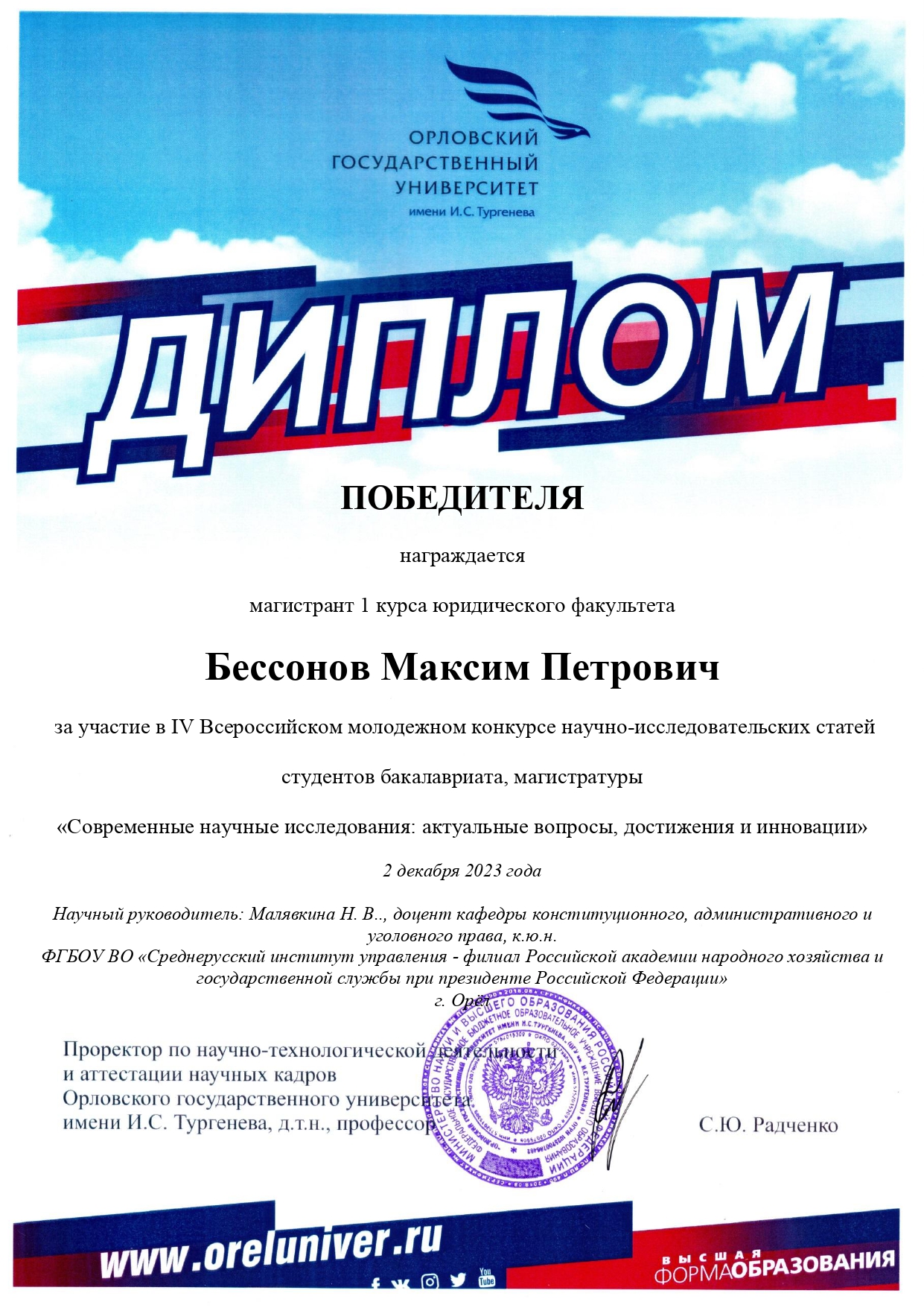 | 11) Диплом победителя IV Всероссийский молодежный конкурс научно-исследовательских статей студентов бакалавриата магистратуры «Современные научные исследования: актуальные вопросы, достижения, инновации» |